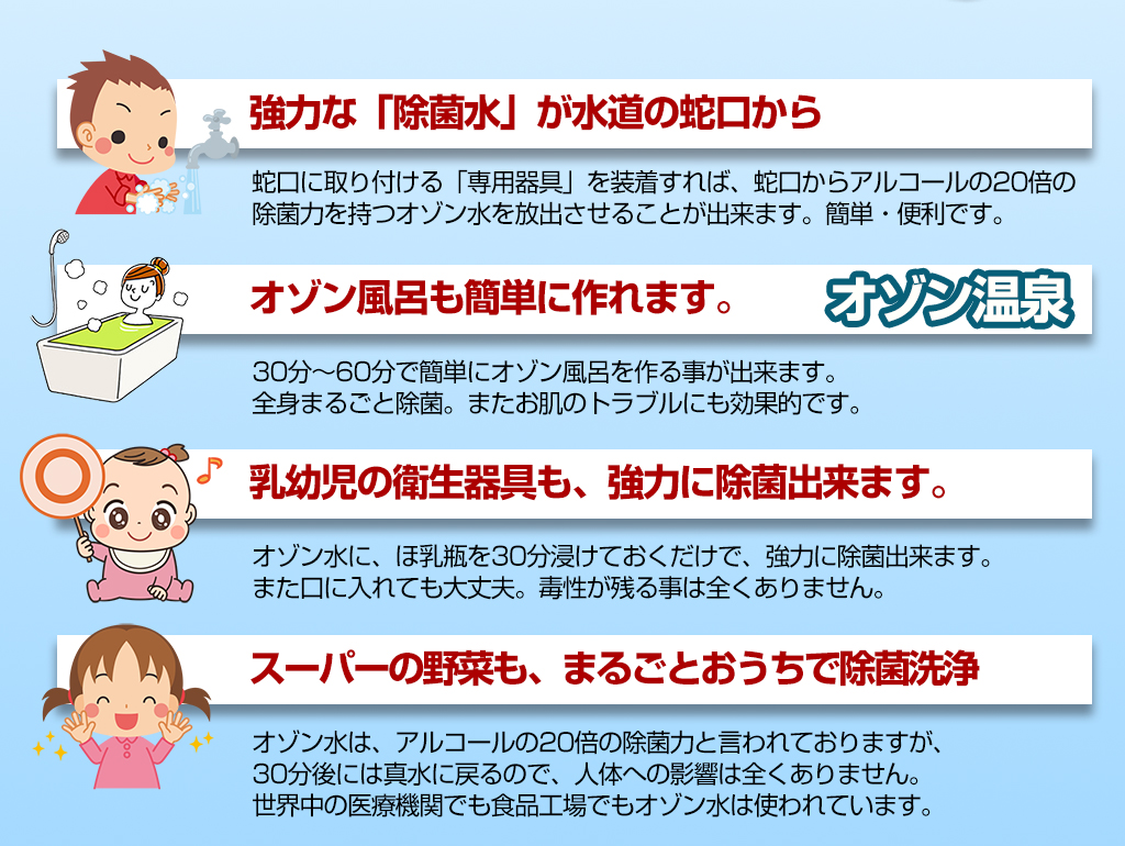 高濃度オゾン水は刺激が強いので、適切な濃度で使用すること。